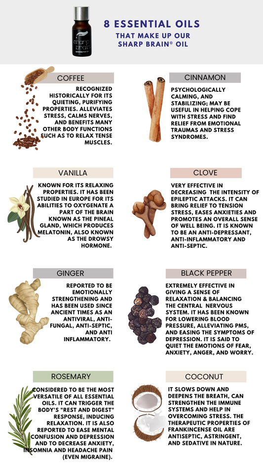 "I have been using Sharp Brain consistently for about 8 months. I work from home for a major corporation as a financial analyst. Detailed documentation and accuracy are the standards I must maintain daily. Sharp Brain enables me to focus while reviewing large amounts of data, to answer the plethora of questions I receive daily, and helps me when I am experiencing brain fog. I have used it topically and diffused it with equal success. With its incredible blend of coffee and spices, Sharp Brain has become a must have in my home office."
